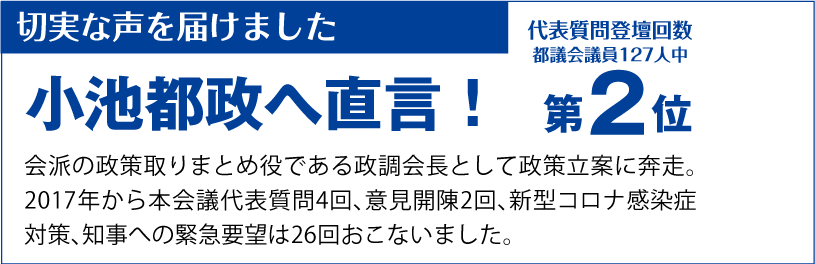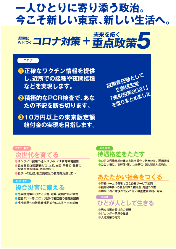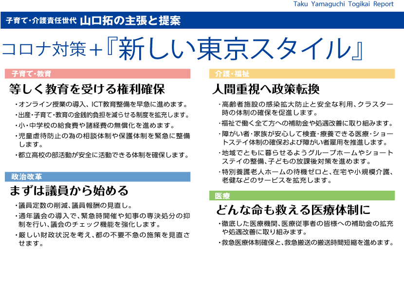 感染したことを隠さず、そして完治したからこそ、この経験を東京都で、世田谷区でしっかりと活かし、すべての問題点を改善していきます。当事者となった私だからこそ提言できる、医療と保健行政の現場、感染者とそのご家族の実情に即した提言をまとめました。